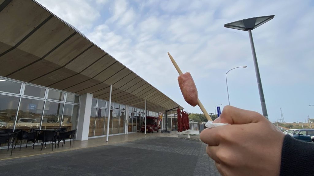 After riding all the way on the highway, we arrived at Agui PA. This is the last parking area before the Aichi Sky Expo (Aichi International Exhibition Center). The stores open at 7:00 a.m., which was just right. Around this area, there were a few poker players. I bought a sausage from a cheerful man, which cheered me up!