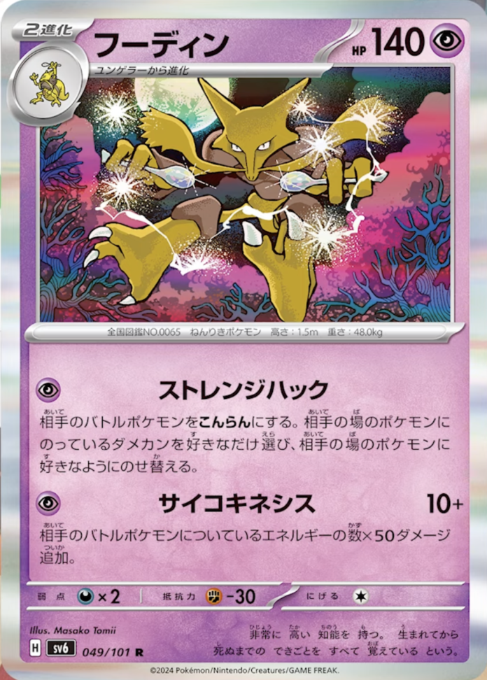 ホーム新弾カードリスト変幻の仮面フーディン 新弾カードリスト変幻の仮面 フーディン 2024-04-03 シェア TwitterLINEFacebookWhatsAppCopy URL ストレンジハック 相手のバトルポケモンをこんらんにする。相手の場のポケモンにのっているダメカンを好きなだけ選び、相手の場のポケモンに好きなようにのせ替える。 サイコキネシス 10+ 相手のバトルポケモンについているエネルギーの数✕50ダメージ追加。 Sourcehttps://www.youtube.com/watch?v=uWCmmRc1wgw Tags超タイプ シェア TwitterLINEFacebookWhatsAppCopy URL 前の記事ユンゲラー次の記事ハッサク 関連する記事 楽園ドラゴーナ ラティアスex 2024-08-31 スターターセット テラスタイプ ニンフィアex 2024-08-04 変幻の仮面 ペロッパフ 2024-04-06 - Advertisment - 上位入賞デッキレシピドラパルトex悪リザードンexルギアVSTARその他サーナイトexロストバレットロストギラティナVSTARカビゴンLOパオジアンexゲッコウガex Most Popular シティリーグ優勝 未来テツノカイナ 2024-03-13 シティリーグ準優勝 悪リザードン ビーダル型 2024-03-13 ジャパンチャンピオンシップシリーズ2025 日程 2024-06-03 シティリーグ2024 シーズン3 オープンリーグ結果 トーナメントセンターバトロコ 本厚木駅前 2024-03-13 もっとロードする