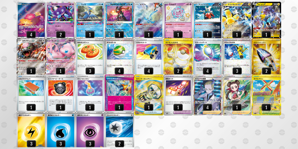 ピジョットとビーダルを両方採用して安定感を出しながら、アンフェアスタンプ、ビワ、ツツジで妨害系で逆転を狙うデッキです。相当、調整されたのだろうなー。すごい!