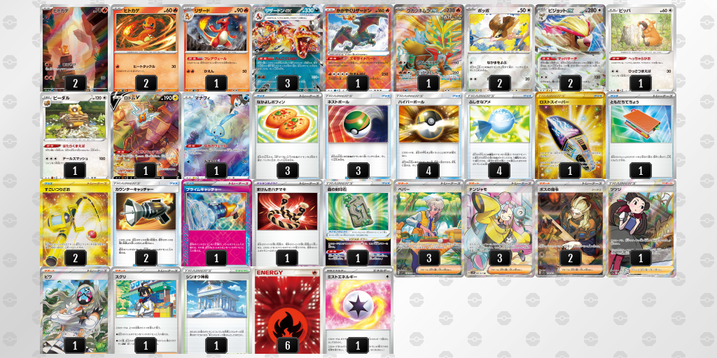 ホームタイプ別デッキレシピ悪リザードンexシティリーグTOP8 悪リザードンex タイプ別デッキレシピ悪リザードンex優勝・入賞デッキレシピシティリーグ新潟県 シティリーグTOP8 悪リザードンex 2024-04-27 シェア TwitterLINEFacebookWhatsAppCopy URL TOP8 Sourcepokemon-card.com TagsウガツホムラexかがやくリザードンビーダルピジョットexプライムキャッチャーマナフィリザードンexロトムV シェア TwitterLINEFacebookWhatsAppCopy URL 前の記事シティリーグTOP4 テツノイバラex次の記事シティリーグTOP8 悪リザードンex 関連する記事 シティリーグ 悪リザードンex|シティリーグTOP2|ステラミラクル環境|2024年09月08日 2024-09-08 シティリーグ 悪リザードンex|シティリーグTOP4|ステラミラクル環境|2024年09月08日 2024-09-08 シティリーグ ルギアVSTAR|シティリーグTOP8|ステラミラクル環境|2024年09月08日 2024-09-08 - Advertisment - 上位入賞デッキレシピドラパルトex悪リザードンexルギアVSTARその他サーナイトexロストバレットロストギラティナVSTARカビゴンLOパオジアンexゲッコウガex Most Popular シティリーグ優勝 未来テツノカイナ 2024-03-13 シティリーグ準優勝 悪リザードン ビーダル型 2024-03-13 ジャパンチャンピオンシップシリーズ2025 日程 2024-06-03 シティリーグ2024 シーズン3 オープンリーグ結果 トーナメントセンターバトロコ 本厚木駅前 2024-03-13 もっとロードする